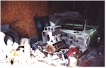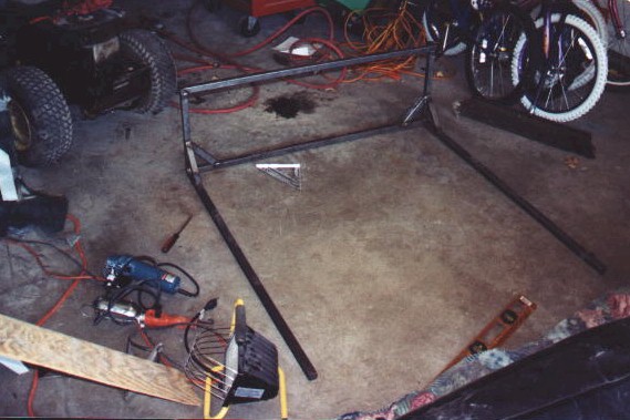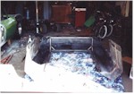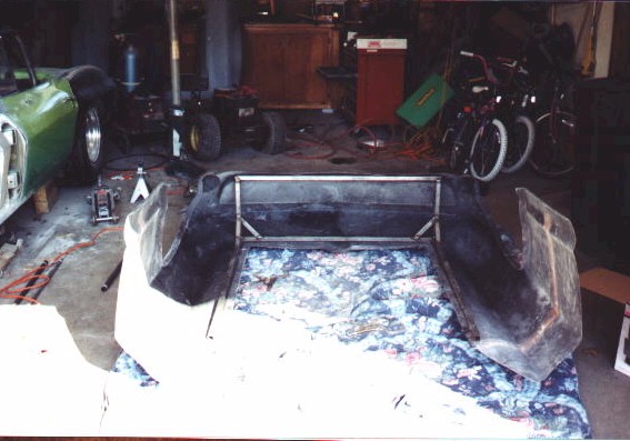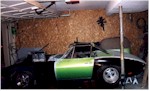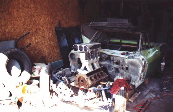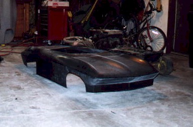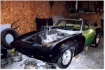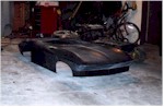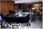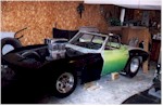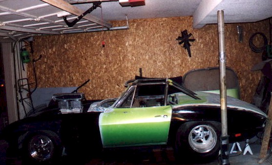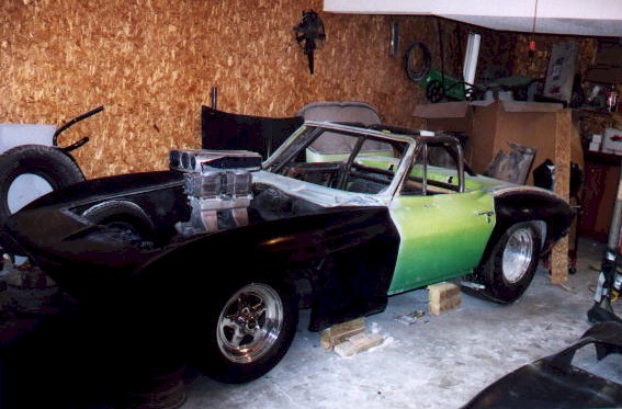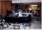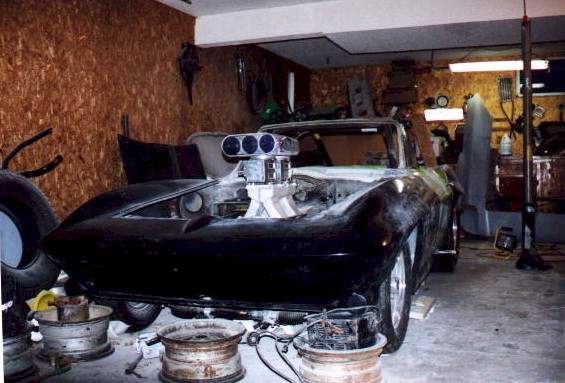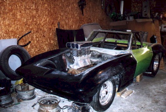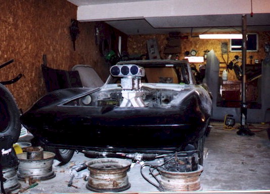 New Front Clip The new front clip was purchased from Creative Glas Works, Inc in Oneida, TN. While looking through their catalog I also found a 1963 corvette go-kart body. So I ordered one of those also. A big vette for dad, and a little vette for the kids. The front clip is one for the racing bodies that Creative Glass sells. Since I had been planning a tilt front end, I built a frame to support the front clip. I have a simple slide and tilt setup working, but I need to work the bugs out. The pictures on the right show the car blocked up and a core block on jack stands in the engine compartment. At this point I have started the roll cage installation. The main hoop, windshield bars, and the rear supports have been welded to the frame. I have also installed the Wilwood front rotors and hubs onto the pinto spindles at this time. |