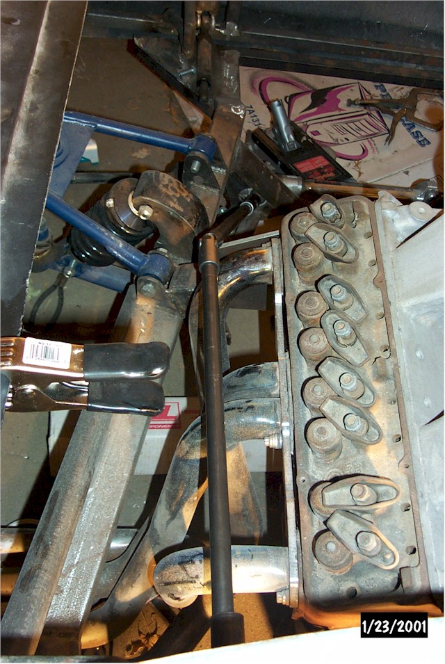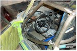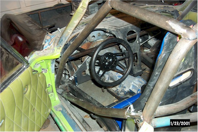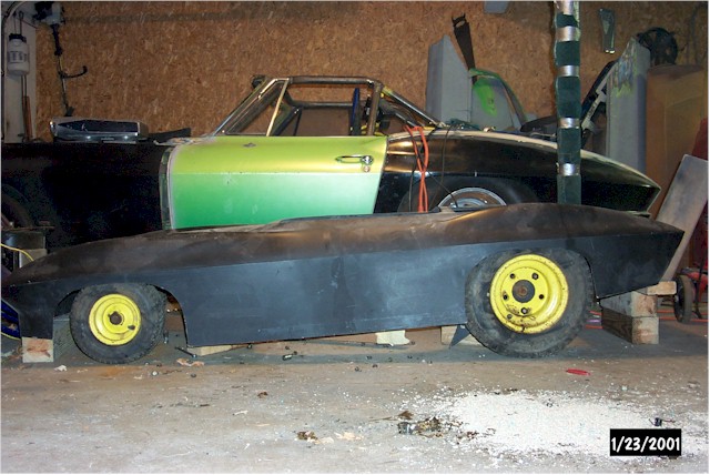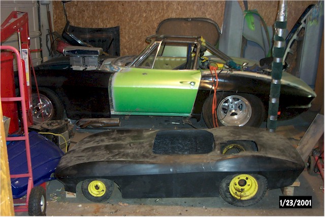 Working on the interior I have acquired a CA Chassisworks steering column kit and Wilwood quick-release steering hub. I also ordered their gas/brake pedal kit, and a brake master cylinder to mount under the floor. After looking at many, many steering wheels, I finally decided on a Grant gr-414 steering wheel. Then, after a few phone calls, trying to find out if it would bolt up to my Wilwood quick-release steering hub (with no answers). I went ahead and ordered it, figuring if no-one makes an adapter, I'd make one. Even the sales people at Grant Products, couldn't tell me if it would bolt up. It will bolt up, if you drill out the holes to 5/16. (There I go again, getting a brand-new part and modifying it as soon as it arrives.) With the steering column hanging in the car, I adjusted it to where it was comfortable. Then I went out to my truck and measured where I have it's steering wheel adjusted to, and it's within a 1/2 inch of where the corvette's ended up. Then it was the typical measure and cut, until everything fit. As you can see to the left, we've finally started mocking up the little corvette. All of the extraneous parts have been removed, and we are ready to start building the frame. The kids can start practicing welding on some scrap, and they'll be on their way to having a corvette of their own. |